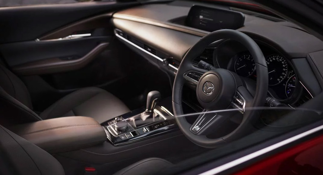 Dasbor terlihat mewah dengan setir palang 3 pada Mazda CX-30. Dasbor dan setir pada Mazda CX-30 terlihat modern dan mewah dengan warna hitam dipadu coklat. Setir Mazda CX-30 ada banyak fitur dengan tombol di palang kanan-kiri. Tombol pada palang setir untuk mengontrol multimedia dan juga mengaktifkan beberapa fitur pada Mazda CX-30.